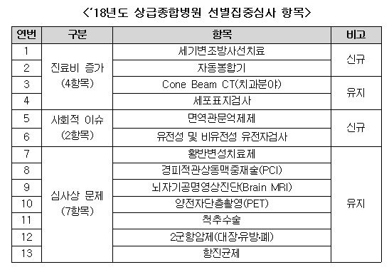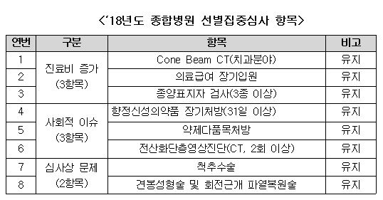 종합병원 선별집중심사 항목은 전년도와 동일하게 △척추수술 △Cone Beam CT(치과분야) △향정신성의약품 장기처방(31일 이상) △견봉성형술 및 회전근개 파열복원술 △의료급여 장기입원 △종양표지자검사(3종 이상) △약제다품목처방 △전산화단층영상진단(CT, 2회 이상)이다.