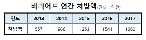 유비스트에 따르면 비리어드의 2017년 누적 원외처방액은 1660억원에 이른다. 전년 기록한 1541억원보다 7.7% 증가한 금액이다.