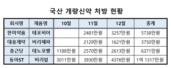 이들보다 한 달 앞서 출시한 종근당 테노포벨은 10월 1188만원을 시작으로 11월 2570만원, 12월 26113만원을 기록하며 세 달 동안 6371만원의 누적 처방액을 올렸다.