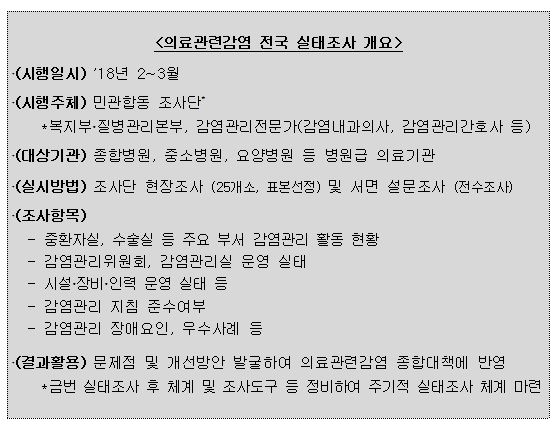 이와 더불어 보건복지부와 질병관리본부는 민간합동 조사반을 구성, 내달부터 전국 병원급 의료기관을 대상으로 의료관련 감염 전국 실태조사를 실시할 방침이다.