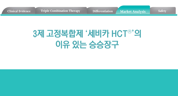 세비카 HCT®는 3가지 성분을 1번에 복용할 수 있고, 제형도 작아 환자가 편하게 복용할 수 있어 복약순응도가 높다. 더욱이 환자를 치료함에 있어 중요한 여러 기준들 중, 풍부한 임상 결과가 있느냐 없느냐는 가장 중요한 기준이 된다. 이러한 이유들로 인해, 세비카 HCT®의 성장세가 지속되어 오리지날 ARB 패밀리에서 전체 시장, 병원 복합제 시장에서 1위를 견인하고 있다.