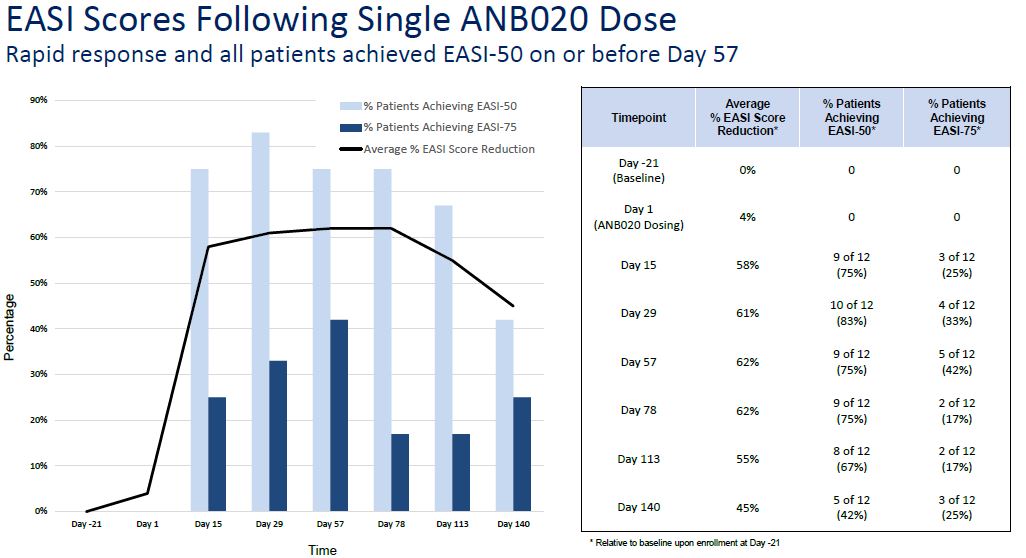 연구팀이 공개한 연구는 2a상 임상으로 12명의 중등도~중증 아토피 피부염 환자를 대상으로진행한 것이다. 이들에게 ANB020 300mg(정맥) 주사 후 29일째(한 달) 아토피증상평가지수(EASI, eczema area severity index)가 50% 이상 개선된 비율(EASI 50)을 관찰했다.