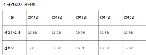 신규 간호사 이직률은 간호사의 두 배를 넘어선다. 2011년 간호사 이직률 17%였다. 그런데 신규간호사는 33.6%를 기록했다. 2014년에는 간호사 이직률 13.9%였고, 신규간호사는 33.5%를 기록했다. 2015년에는 간호사 이직률이 12.6%로 전년보다 많이 감소했지만 신규 간호사 이직률은 33.9%로 오히려 올랐다.
