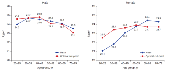 그 결과 '체질량지수'는 연령대 별로 남성에서 23.1~24.8kg/㎡, 여성에서 22.5~23.9kg/㎡로 현재 한국에서 적용되는 비만기준에 따를 때, 대부분 '과체중 범위'에 해당했다.