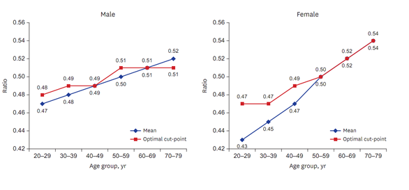 '허리둘레-키 비율'은 남성 20대는 0.48, 30대와 40대는 0.49, 50~70대 0.51로 나타난 반면, 여성은 20대와 30대에서 0.47, 그 이후로 점차 증가해 70대는 0.54에 해당했다.