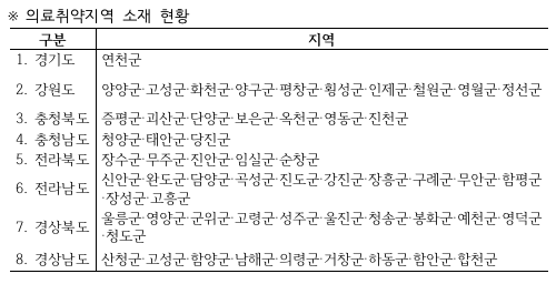 현행 법령에 따른 의료취약지역은 경기도 연천군과 강원도 양양군 등 전국 58개 군이며, 이들 지역 소재 병원급 의료기관은 88곳 정도다.