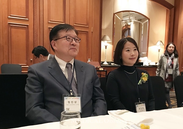 대한신경과의사회는 25일 밀레니엄호텔서울에서 열린 제28차 춘계학술대회에서 정부의 치매국가책임제에 신경과 의사의 참여는 배제됐다고 주장했다. 이날 간담회에는 대한신경과학회 정진상 이사장도 참석해 힘을 보탰다. 왼쪽부터 신경과학회 정진상 신임 이사장, 신경과의사회 이은아 신임 회장.