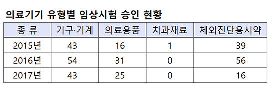 체외진단용 의료기기는 임상시험건수가 2015년 39건, 2016년 56건, 2017년 16건으로 줄었지만 피부점막·조직 등을 채취해 에이즈(HIV), C형 간염(HCV) 등을 진단하는 면역검사시약은 2015년 6건, 2016년 7건, 2017년 7건으로 꾸준했다.
