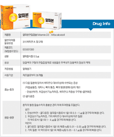 활성형 비타민 D의 경우, 골다공증에서 bisphosphonate와 병용할 시 작년부터 보험 적용을 받을 수 있게 됐다. 과거에도 칼슘제제와 호르몬 대체 요법의 병용, 칼슘제제와 그 외 비호르몬 요법의 병용, bisphosphonate와 일반형 비타민 D 복합 경구제가 보험 적용을 받고 있었으나 작년부터 bisphosphonate 단독 제제와 활성형 비타민 D 단일제의 병용도 급여로 인정된 것이다.