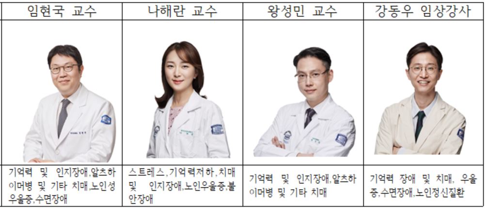 이를 위해 올해 3월 1일부로 관련 전담 의료진 3명(정신건강의학과 나해란, 왕성민 교수, 강동우 임상강사)를 보강, 임현국 센터장을 포함한 총 4명이 뇌벤저스로 활동하면서 건강한 뇌 관리 및 치매 사전예방을 위해 보다 전문적인 진료를 실시한다.