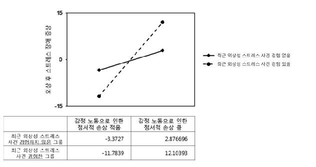 그 결과 최근 외상성 스트레스 사건을 경험한 소방관 중 감정 노동으로 인한 정서적 고통이 큰 소방관은 외상 후 스트레스 장애 증상이 더 심각한 것으로 나타났다.