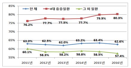 공단에 따르면 지난 정부 추진된 4대 중증질환 보장성 강화정책으로 4대 중증질환의 보장률은 80.3%까지 높아졌지만, 그 외 환자들의 보장률은 전반적으로 낮고, 예년에 비해 오히려 매년 낮아지고 있다.