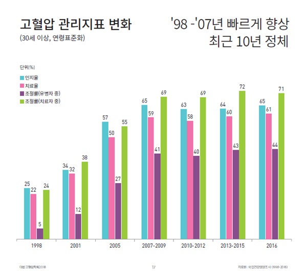 고혈압 관리 실태를 평가하는 관리지표인 고혈압 인지율, 치료율, 조절률은 처음 조사를 시작한 1998년부터 2007년까지는 빠르게 증가했지만 그 이후로는 거의 변화가 없었다.