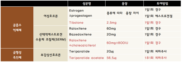 조직선택적 에스트로젠 복합제인 bazedoxifene/conjugated estrogen은 골다공증 치료제가 아닌 예방약제로 승인됐다. 칼시토닌과 스트론튬도 승인됐으나, 이상 반응이 보고돼 사용이 제한적이다.