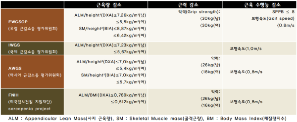진단기준은 근육량 감소, 근력 감소, 근육 수행능 감소가 일어나는 경우로 진단하나, 구체적 평가방법과 기준은 근 감소증 유관학회마다 다소 차이가 있다고 덧붙였다.