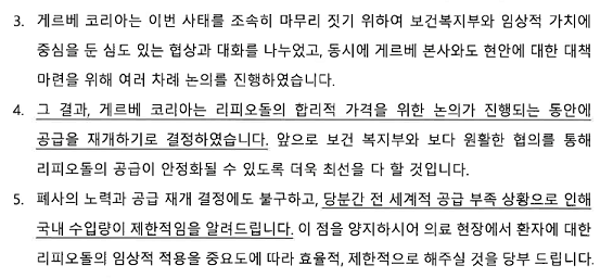 환자단체는 "최근 게르베가 리피오돌 수입을 재개하겠다고 발표했으나 '합리적 가격을 위한 논의가 진행되는 동안'이라는 단서를 붙이고 있다"면서 "국내 수입량이 제한적이어서 임상현장에서는 중요도에 따라 효율적, 제한적으로 처방해 줄 것을 당부하는 등 심평원과의 약가조정이 결렬되면 언제든지 공급 부족으로 환자 피해가 예상되는 상황"이라고 말했다.