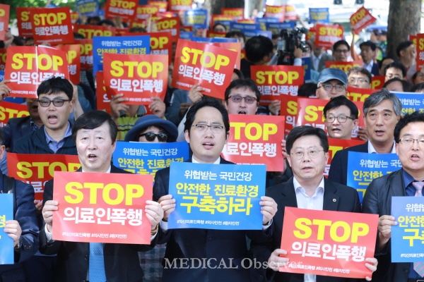 대한의사협회는 8일 오후 서대문경찰서 앞에서 '의료기관 내 폭행근절 범의료계 규탄대회'를 개최했다.