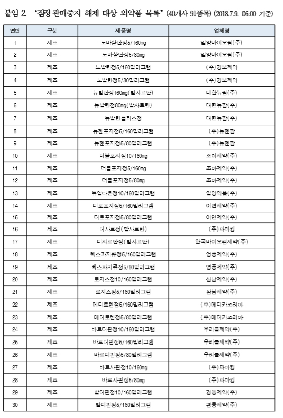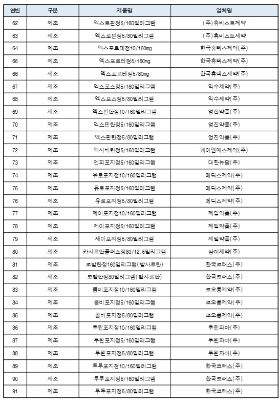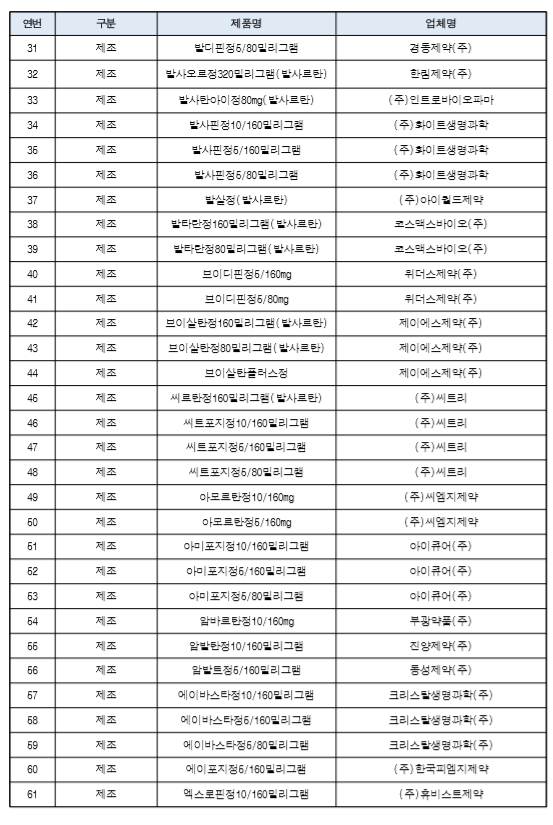 해당 품목은 일양바이오팜 노바살탄정, 경보제약 노발탄정, 대한뉴팜 뉴발탄정, 뉴제팜 뉴젠포지정, 조아제약 더블포지정, 일양약품 듀얼다운정, 이연제약 디로포지정, 영풍제약 렉스파지큐정, 삼남제약 로지스정, 파마킹 디사르정/바르사핀정, 우리들제약 바르디핀정, 경동제약 발디핀정, 한림제약 발사오르정, 화이트생명과학 발사핀정, 아이큐어 아미포지정, 부광약품 암바르탄정, 진양제약 암발탄정, 크리스탈생명과학 에이바스타정, 휴비스트제약 엑스로핀정, 한국휴텍스제약 엑스포르테정, 영진약품 엑스포스정, 코오롱제약 콤비포지정, 한국코러스 투투포지정 등이다.