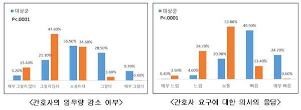 간호사는 73.7%가 입원전담전문의로 인해 업무량이 감소되었다고 답했으며, 74.6%에서 이전보다 입원환자 진료에 대한 의사의 응답시간이 빨라져 74.1%가 입원전담전문의와 근무를 지속하길 희망했다.