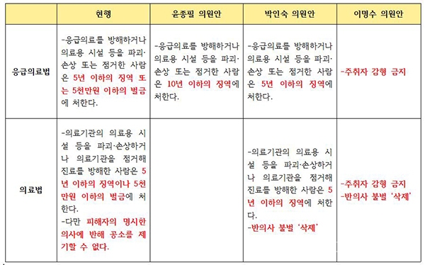 현행 응급의료법은 응급의료를 방해하거나 의료용 시설 등을 파괴·손상 또는 점거한 사람에 5년 이하의 징역 또는 5000만원 이하의 벌금에 처하도록 하고 있다.