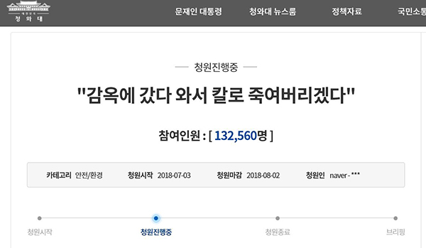 익산 응급실 폭력사건을 계기로 지난 3일 시작된 해당 청원에는 31일 21시 현재 13만 2560명이 참여하고 있다. 청원답변 기준인 20만명에는 다소 못 미치는 수준으로, 청원 마감일은 오는 8월 2일이다.
