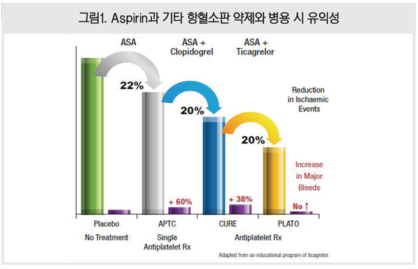Aspirin에 clopidogrel, ticagrelor 등 다른 기전의 항혈소판 약제를 추가할 때, 허혈성 사건(ischemic event)의 발생 빈도는 약 20%씩 감소한다<그림1>.