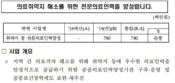 보건의료분야 사업 가운데는 취약지 등 전문의료인력양성 사업이 눈에 띈다.