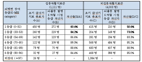 결과에 따르면, 뇌졸중 초기에 집중재활치료를 받은 환자군은 그렇지 않은 환자군에 비해 뇌병변 장애 등급이 발병 시점보다 6개월 후 뚜렷하게 개선됐다.