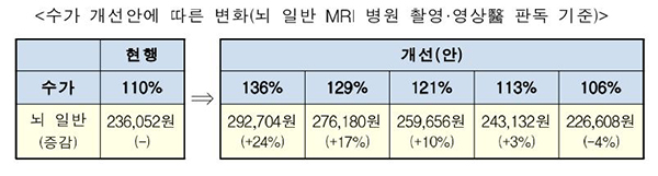 정부와 학회는 뇌 MRI 급여에 맞춰 수가 개선작업을 벌여왔으며, 그 결과로 현행 110% 단일수가를 106%~136% 차등수가로 개선키로 했다.