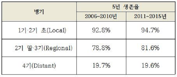 대장암 1기 혹은 2기 초(Local)인 경우 2006년~2010년 5년 생존율이 92.8%, 2011~2015년 94.7%로 매우 높았고 2기 말이거나 3기(Regional)의 경우에도 같은 기간 78.8%에서 81.6%로 생존율이 높아진 것으로 나타났지만, 간‧폐‧복막 등으로 원격 전이가 나타난 4기(Distant)의 경우에는 같은 기간 생존율이 19.7%에서 19.6%로 큰 변화가 없는 것으로 분석됐다.