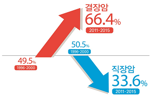 1996~2000년 남성의 전체 대장암 중 좌측결장암 발병 비율은 23.6%에서 2011~2015년 33.3%로 증가했고, 같은 기간 여성의 우측결장암 발병 비율은 17.7%에서 25.4%로 증가한 것으로 조사됐다.
