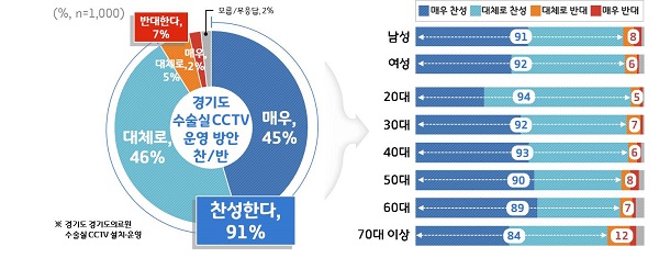 그 결과 경기도민 91%가 경기도가 경기도의료원 수술실 설치·운영하는 것에 대해 '찬성'했고, 93%가 수술실 CCTV 설치·운영이 의료사고 분쟁해소에 도움이 될 것이라고 답했다.