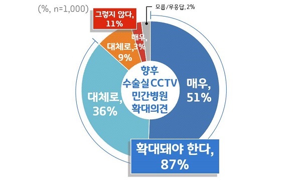 CCTV 설치·운영을 민간병원까지 확대해야 하는가에 대한 물음에는 87%(매우 51%, 대체로 36%)가 긍정적 답변을 했다.