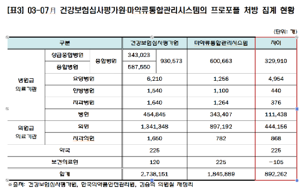 김 의원은 심평원과 식약처 마약관리시스템 집계의 격차도 지적했다.