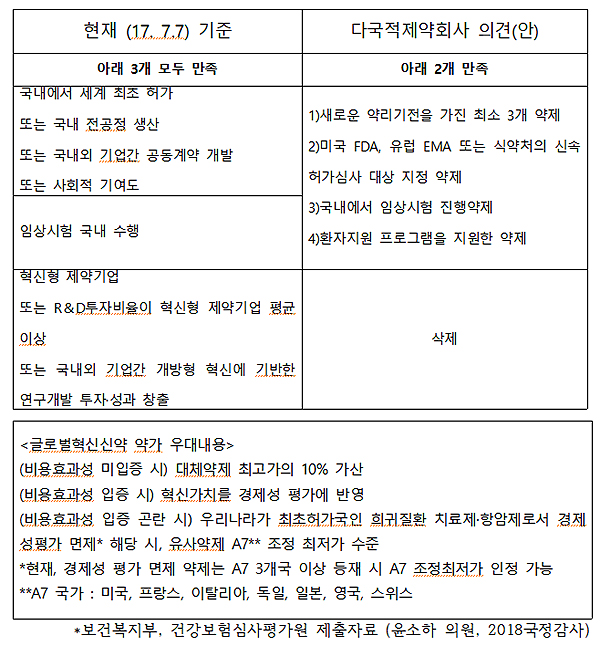 심평원이 윤소하 의원에 제출한 다국적사 측 의견을 살펴보면, ▲새로운 약리기전을 가진 최소 3개 약제 ▲미국 FDA, 유럽 EMA 또는 식약처의 신속허가심사 대상 지정 약제 ▲국내에서 임상시험 진행약제 ▲환자지원 프로그램을 지원한 약제 중 2개를 만족한 약제는 약가우대를 해달라는 것이다.