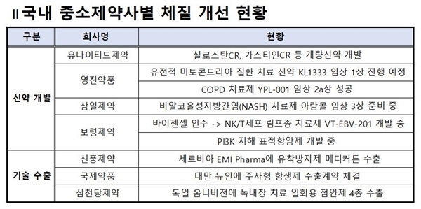 업계 한 관계자는 "국내 중소제약사는 제약 환경이 척박해지면서 맞은 위기를 극복할 방안이 필요한 상황"이라며 "R&D를 강화해 신약을 개발하고, 이 과정에서 기술을 수출하는 등의 방안을 대안으로 삼아야 살아남을 수 있다"고 조언했다.