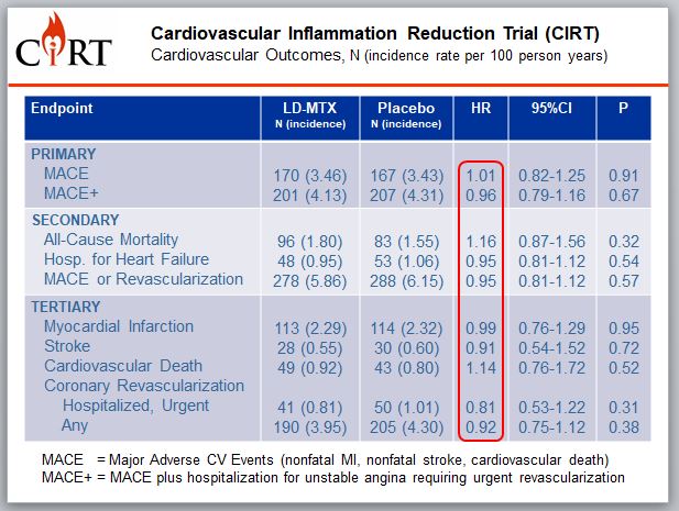 환자는 미국과 캐나다에서 모집했으며, 대부분 심근경색 이력이 있거나 다혈관심혈관 질환이 있는 경우였다. 또한 제2형 당뇨병 또는 대사증후군을 동반하고 있었다. 이와 함께 MTX 용량은 주 1회 15~20mg을 사용했다. 1차 종료점은 주요 심혈관 사건(MACE)를 관찰했다.