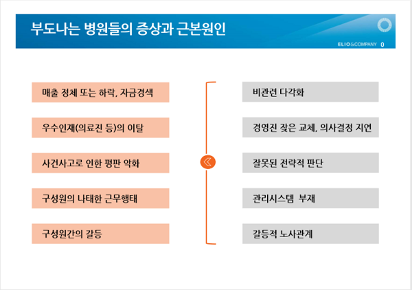 부도나는 병원들의 증상도 몇 가지 소개했다. 경영이 잘 될 때 이사장이 갑자기 분양사업에 뛰어들거나, 경영진이 자주 교체되면 언제든지 망할 수 있는 지표라고 지목했다. 또 병원 규모가 커지면 전략적 판단도 달라져야 하는데 과거와 같은 결정을 하거나 관리시스템과 노사갈등 등도 그 원인이라고 말했다.