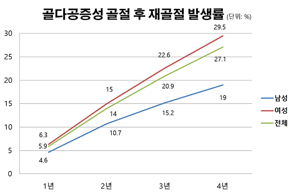 최초 골절 발생 후 재골절 누적 발생률은 총 환자 13만 8131명 중 1년 차에 4.9%(8193명), 2년 14.0%(19338명), 3년 20.9%(28890명), 4년 27.1%(37395명)이었다. 특히 4년 차를 기준으로 여성은 29.5%로 남성(19.0%)보다 1.6배 더 높았다.