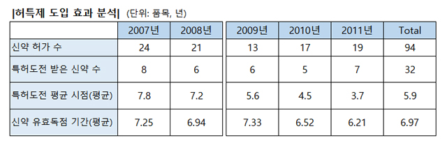 2009년에는 13개, 2010년 17개, 2011년 19개 신약이 허가됐으며 이들 중 특허 도전을 받은 신약은 각각 6개, 5개, 7개 품목이다. 특허도전까지 걸리는 시간은 2009년 평균 5.6년, 2010년 4.5년, 2011년 3.7년으로 분석됐다.