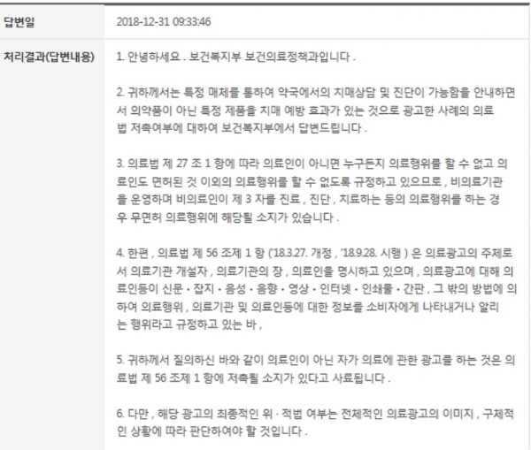 한편, 바른의료연구소는 복지부의 회신 내용을 근거로 관할 지자체에 엄격한 처분을 요청할 방침이다. 또 식품의약품안전처에 의약품 오인광고 여부에 대한 민원을 신청했다.