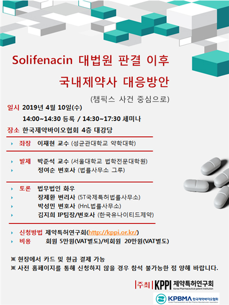 솔리페나신 판결 쟁점 정리부터, 향후 국내제약사의 염변경 의약품의 개발 방향까지 심도있게 논의하는 자리가 될 수 있을 것으로 예상된다.