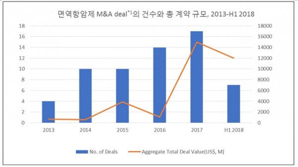 2013년부터 2018년 상반기를 분석한 자료를 바탕으로 분석한 결과 기간 내 인수합병 거래는 점진적으로 증가해 2017년에는 총 16건, 170억달러(19조 2270억원)로 인수합병 건수와 계약규모에서 최고치를 기록했다.