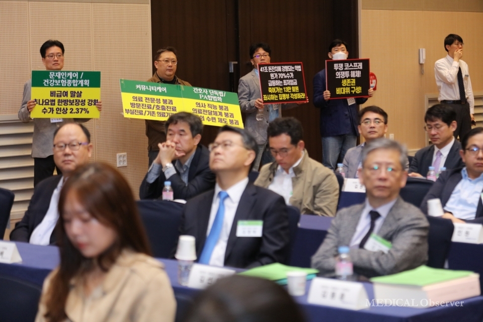 이 정책관이 축사를 대독하는 동안 피켓시위를 진행하는 일부 회원들이 "문재인 케어와 커뮤니티 케어 정책을 중단하라"며 큰 목소리로 항의를 했다.