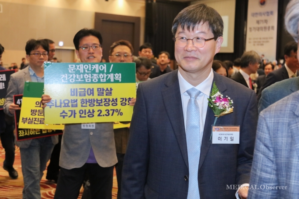 이날 정기총회에서 일부 회원이 현 정부의 의료정책과 집행부를 비판하는 피켓시위를 진행했다.
