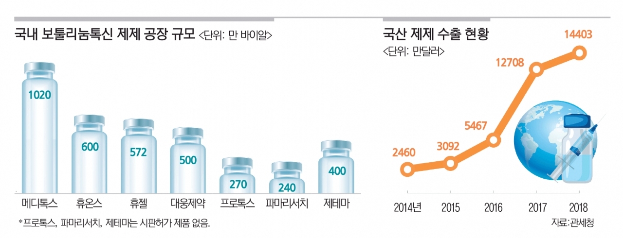 실제로 시장 성장세도 여전하다. 관세청에 따르면 2018년 국산 보툴리눔톡신 제제의 수출액은 1억 4403만달러를 기록하며 꾸준히 커지고 있다. 업계에서는 올해 2억달러 수출액을 기록할 것으로 전망한다.