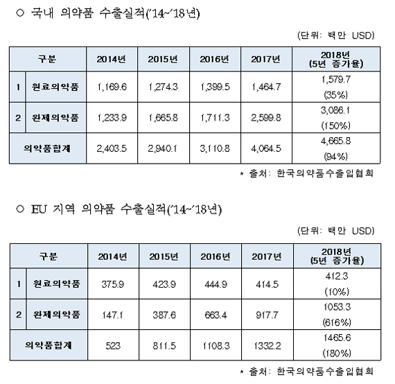 반면 같은기간 원료의약품 수출실적은 376백만달러에서 412백만달러로 약 10% 성장하는데 그쳤지만, EU와 GMP 분야에서 동등한 국가로 인식된 만큼 수출이 수월할 것이란 예상이다.
