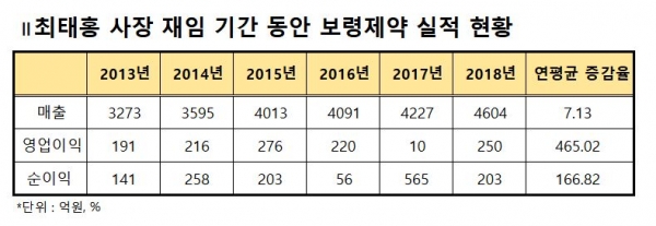 최 대표가 취임한 2013년부터 2018년까지 매출은 연평균 7.13%, 영업이익과 순이익은 각각 465.02%, 166.82% 성장한 것이다.