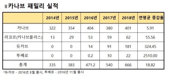 카나브, 카나브플러스, 듀카브, 투베로 등 카나브 패밀리는 2014년 355억원의 원외처방액(유비스트 기준)을 올린 것을 시작으로 2015년 383억원, 2016년 471억원, 2017년 540억원, 2018년 666억원을 올리면서 연평균 18.8%의 성장율을 보였다.