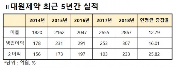 최근 5년간 대원제약의 실적을 보면, 매출은 2014년 1820억원에서 2015년 2162억원으로 2000억원대 고지에 올라섰다.